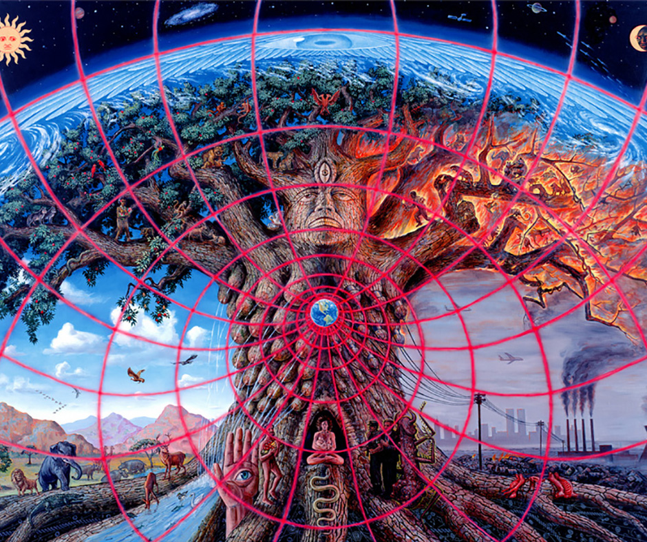 L’albero della vita brucia su questo piano della realtà e chissà cosa accade laggiù, “nel sottile”, nel “non misurabile” dove ancora non vedo con chiarezza. Per indagare mi affido all’arte visionaria di Alex Grey ed ecco che, come anni fa con Rivera, mi meraviglio scoprendo il ripetersi della magia di una visione: eccolo l’ Albero della Vita che brucia e che nutre (guarda il video vai al minuto 5:35).